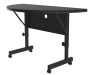 This half round table has a depth of 24" and a width of 48". Just flip the top, and wheel it to where it has to go. Once you get it to where you need it, lock the casters. Then depending on the height you need for your event, you may adjust the table from 23" to 31" to fit your needs.