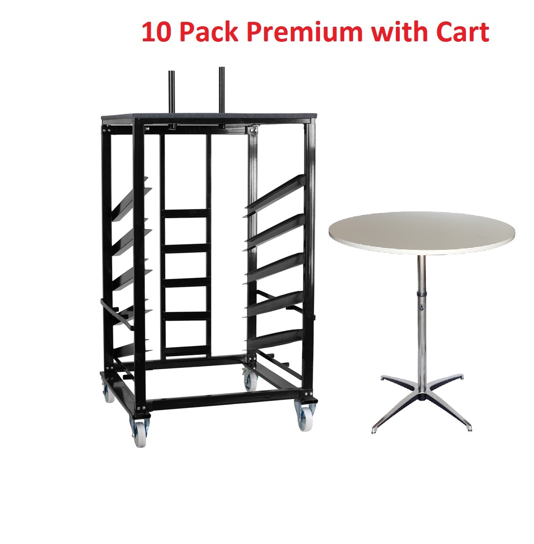 This 10 pack includes our premium adjustable base and premium cocktail tables with laminate top on a plywood core.